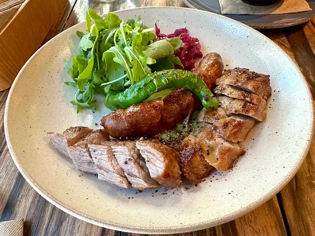煎烤二層肉也很喜歡,一旁的香腸是驚喜,沒想到有搭配香腸。二層肉和香腸都乾香味美,配上青豆泥和漬菜,完美!