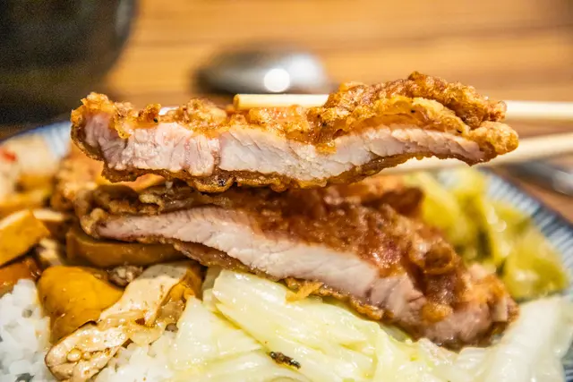 一級排骨的排骨飯一上桌,你就會明白為什麼店名會叫「一級排骨」,排骨的厚度相當驚人,差不多有1公分,完全不像外面許多排骨飯的小塊肉,整塊排骨看起來非常大方,雖然厚度十足,但吃起來卻一點也不柴也多汁,咬下去的口感相當紮實非常滿足