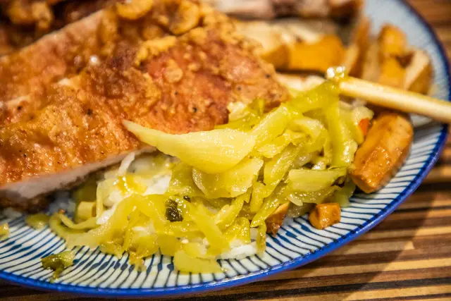 總共有三種配菜,但應該都是隨機出菜的,今天是有高麗菜、豆乾與酸菜,配菜的份量也算是多,米飯的表現也不錯不會太濕軟,酸菜脆度有出來,配著炸物一起吃蠻解膩的