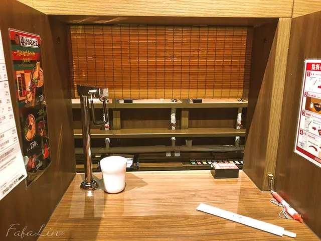入座時簾子是升起的,店員會送上菜單與美耐皿材質的水杯,可自己使用旁邊的水龍頭加水(微冰),很方便。等到送上拉麵餐點齊全後店員會將簾子拉下,這時便能享受一人用餐時光。有什麼事情按右側櫃台邊的服務鈴即可。
