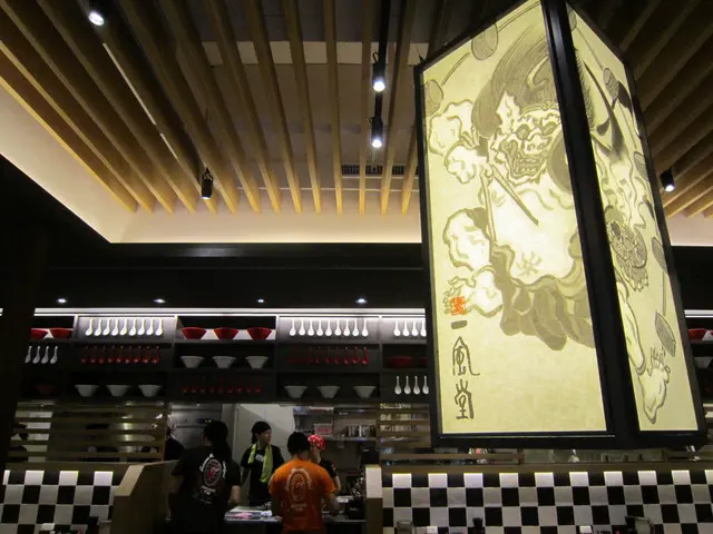 店內的擺設是用紅白拉麵碗和湯勺做裝飾,既有拉麵店的風格又有特色,而店員也都綁上了頭巾,帶點日本味眼前天花板上的長型燈籠更是特別~