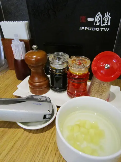 每張桌子的桌面上除了黑胡椒、醬油、辣油、白芝麻這幾種常見的醬料擺放在桌上,還有一小碗貼心剝好的蒜頭和一個榨泥器,而蒜頭泡著水應該是想減少那股嗆辣味還有避免氧化而變黑吧