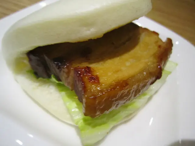 一風堂和風叉燒小刈包NT$60─這道可是因為台灣而有的創意料理,將整塊有著照燒醬的叉燒和生菜放在刈包中,當然厚度和大小比起拉麵中的叉燒大許多,不過刈包的比例可是非常小,男生大概兩口就可以解決掉,之中的叉燒肥油的比例有些高,所以吃起來有油膩感我不是很愛