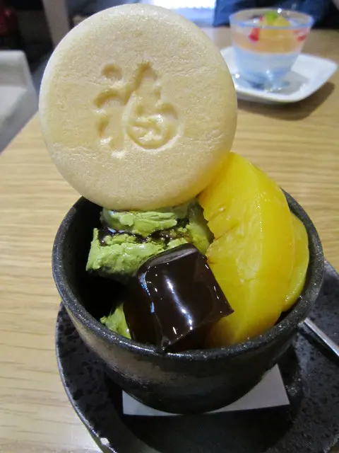 摩納卡抹茶冰淇淋$60─雖然小小一杯倒也是滿豐富的,除了主角的抹茶冰淇淋,還有罐頭水蜜桃切片、寒天、和最上面的米果餅,吃完幾道鹹食來個甜點是最適合不過了