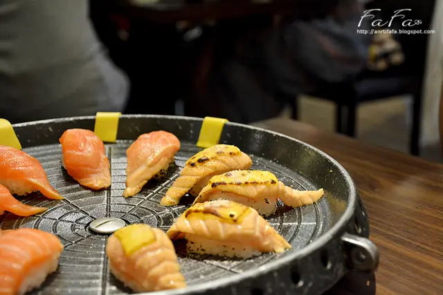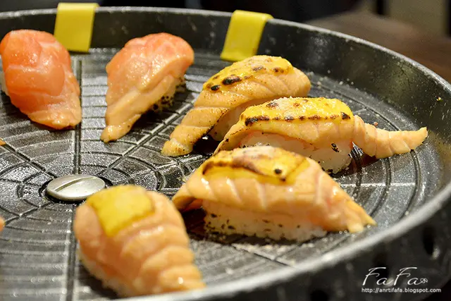接著這盤便端到下一桌再繼續炙燒活動,我這才發現原來其他起司鮭魚握壽司並不是我們的。