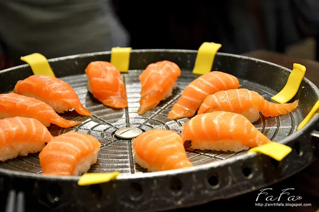 鐵盤裝盛的起司鮭魚握壽司一出現在我們面前,讓我驚呆了,