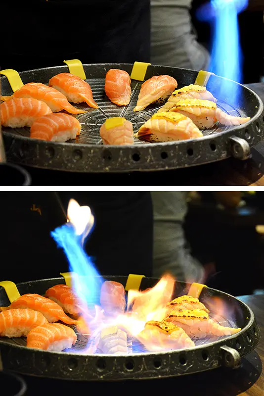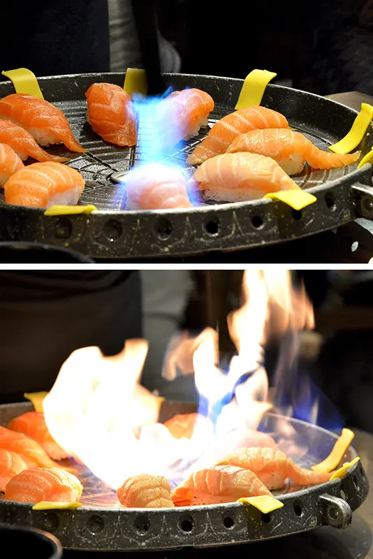 接著便開始炙燒鮭魚握壽司,火焰四射照亮著它們。