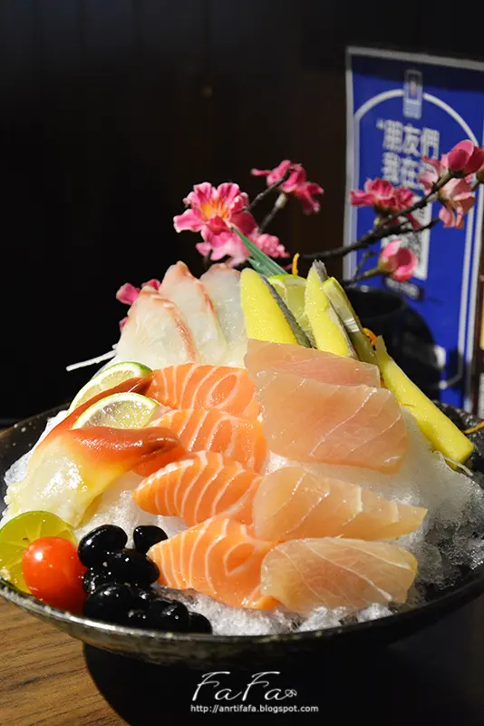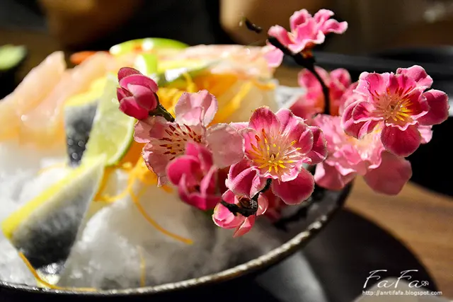鋪得滿滿的生魚片拼盤,猶如富士山的壯麗,點綴在旁裝飾梅花也讓這座小山更為動人。