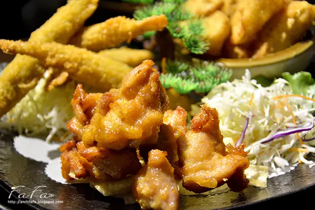 以松柏盆景裝飾頗可愛,在一片金黃色系中的一叢綠,讓這盤炸物散發誘人氣息。