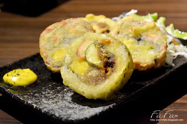 金黃杏鮑菇麵衣與炸柳葉魚一樣相當細緻密度高,偏脆硬,柳葉魚身型漂亮麵衣完美覆蓋,魚卵豐富。