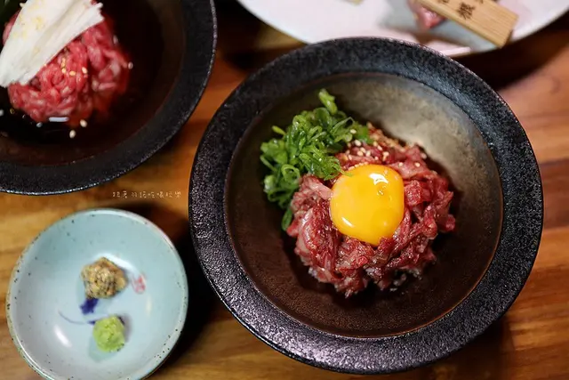 將生牛肉壽司搭配生蛋黃、海苔、紫蘇葉、酪梨醬四種口味