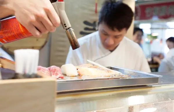 排隊時服務人員已預先點餐,因此一就定位師傅正忙著製作握壽司 -
