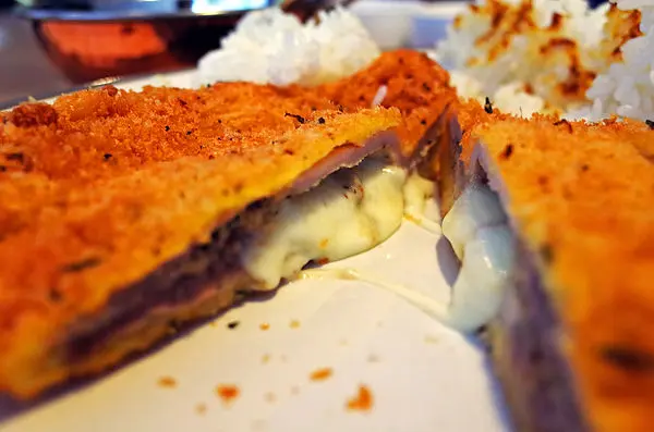 濃郁傾洩而出的米色馬茲瑞拉起司口感滑順,和柔軟多汁的香草豬排搭配太完美了。