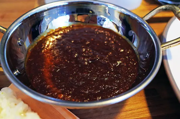 淋上豬排或白飯都吃得出裡面有許多香料蔬果打碎成泥的咖哩醬,味道特別但不失美味。