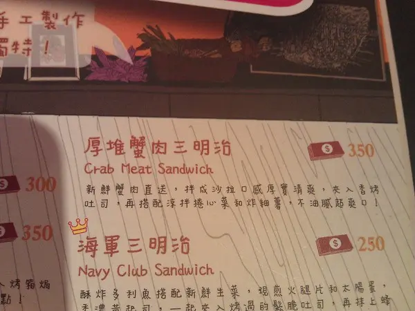 1.厚堆蟹肉三明治350元 單點價