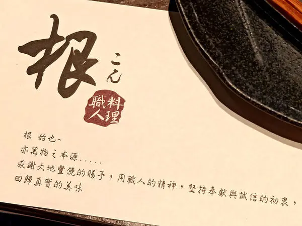(桌上的餐墊述說著根職人的料理精神)