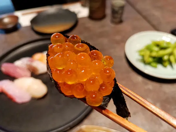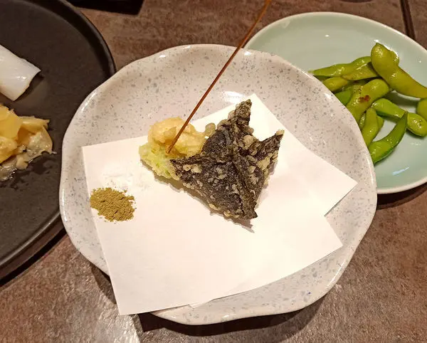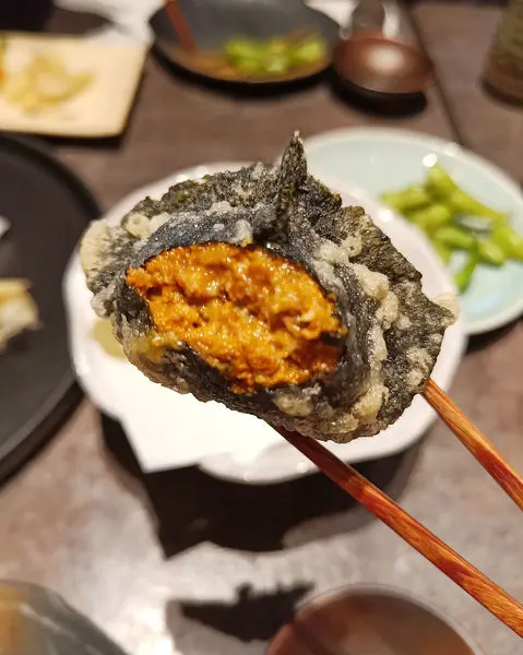 外層的海苔裹粉炸過後不油又酥脆,裡頭海膽有如奶油般細緻滑順,細細的甜味讓人欲罷不能