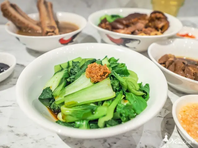 鮮脆的青菜,搭配上方點綴的蒜酥入口,更增添香氣。