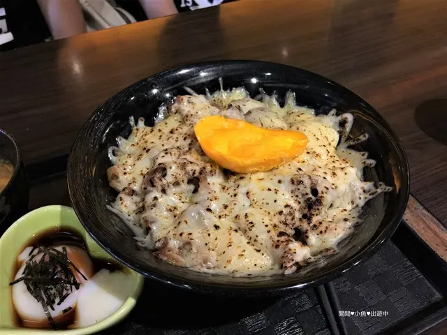 丼飯上本來都會附上一顆生蛋黃, 但現在禽流感我們還是吃熟蛋比較保險,