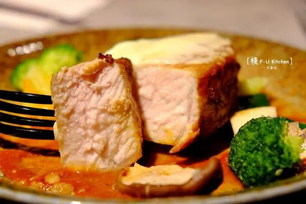 豬肉肉質吃起來相當Q彈、軟嫩,搭著上頭融化的起司一起食用,更添香氣,