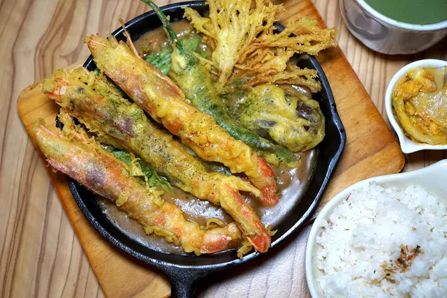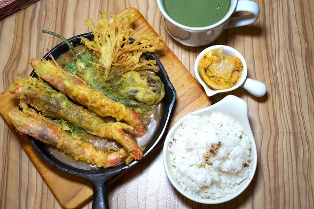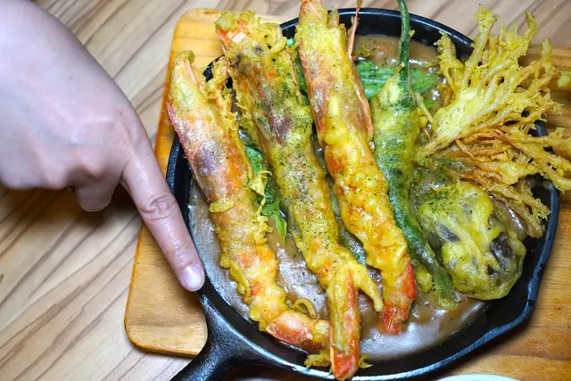 天婦羅炸蝦裡頭還有酥炸金針菇花、香菇、糯米椒、還有野菜