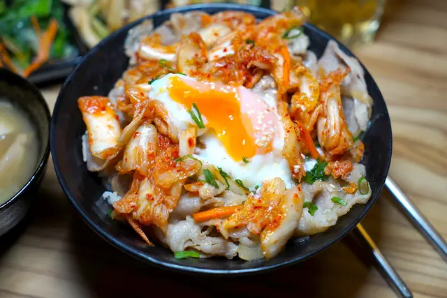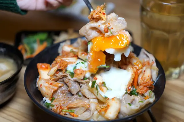 將米飯、豬梅花、泡菜、溫玉子一起均勻攪拌