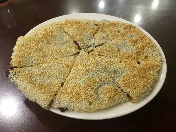 這邊的豆沙鍋餅是比較厚的,裡面的豆沙餡非常多,咬一邊、另一邊就會爆出來