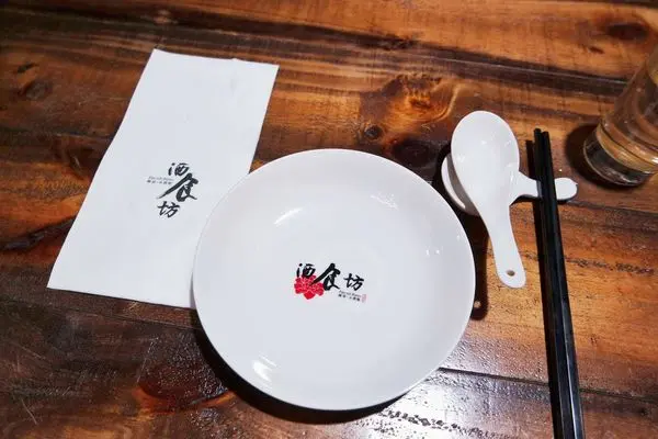 桌上擺放整齊的餐具,餐盤紙巾上都印有酒食坊LOGO非常醒目。