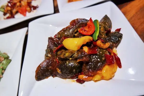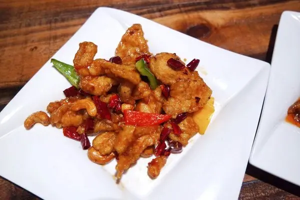 油炸過後的雞肉配上醬汁與食蔬一起熱炒,再加上腰果整道菜變的更有質感,