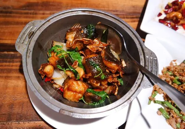 平常都會吃三杯雞、三杯中卷或是三杯杏鮑菇這種下飯的三杯系列,酒食坊居然有特別版「三杯鱸鰻」就點此來嚐鮮,上桌時還滾燙冒著熱氣的鐵鍋,飄散出麻油與九層塔堆疊出的誘人香氣,