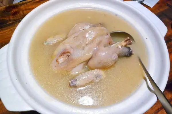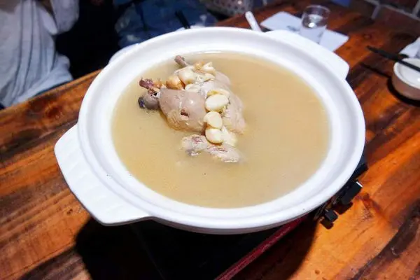 最後一道雞湯份量大的驚人,沙鍋裡面有一整隻小土雞、蒜頭,先舀起一碗泛著暖暖油光的雞湯,熱呼呼暖心的溫度傳達至掌心內,