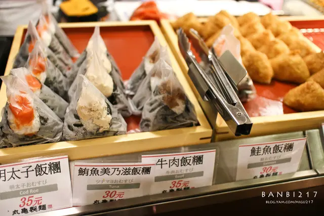 新鮮現炸的炸物天婦羅從蔬菜到海鮮到肉類都有,價格從$25~$35之間。丸龜製麵的飯糰種類有明太子、鮪魚美奶滋、鮭魚、牛肉以及稻禾壽司(豆皮壽司),飯糰也是新鮮包好的,拿在手裡還能感受到溫熱感。