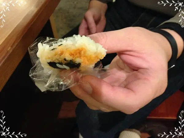 鮭魚飯糰$30:比超商的三角飯團少一個個頭,是溫熱的,在最上頭的那一個角和飯糰中心放有鮭魚絲,就只有鮭魚絲、白飯、紫菜等料而已,鮭魚絲炒得很酥有點像是肉鬆的口感,味道剛剛好,很不錯吃~