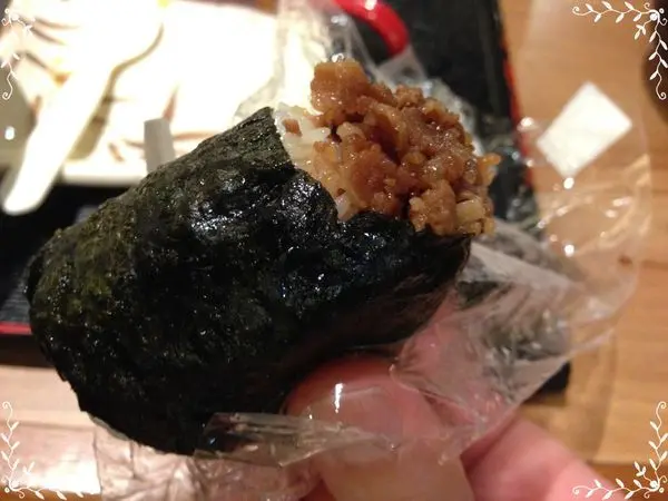 牛肉飯糰$35:相當的油膩,飯糰的塑膠袋還沒打開完手就油油的,同樣只有在最上頭的那一個角和飯糰中心放有牛肉,再搭配白飯、紫菜等料而已,味道比較重香氣也比較足夠,也是滿不錯的的只是一整個大油~