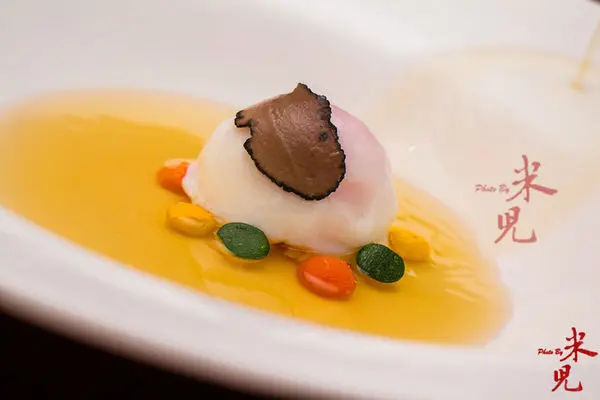 松露風味澄清雞湯襯低溫初生紅蛋及珍珠蔬菜,這也是這裡的經典湯品,百喝不厭~