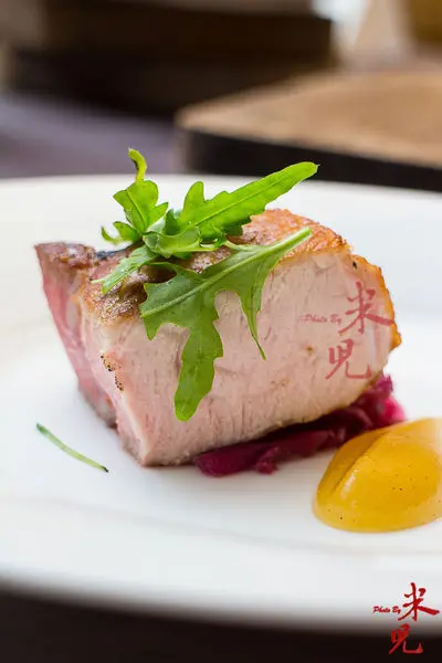 乾式熟成豬肉的美味,真令人驚訝而無法想像,直接吃很美味,搭配盤邊的香草籽蘋果泥又是不同的滋味~