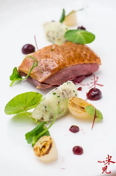 上星期,陳師傅就興奮地告訴米兒,他的研究成果終於可以發表了,迫不及待的我,馬上趕第一個去試試他的乾式熟成鴨,只見陳師出一個大大的木板,上面放著一隻.......北京烤鴨?唔~~除了屁股的地方有一個大的開口、烤出來的表皮上有一些像娠娠紋般的紋路之外,這烤得表皮金黃的鴨子,看起來真的跟北京烤鴨沒兩樣,於是陳師傅開始解釋這鴨子的與眾不同。原來,師傅是選用養在花蓮地區的「英桃種北京鴨」,因為這種鴨子的肉質纖維比較細,而且特別挑選重量達到五斤的肥鴨子,其皮下脂肪才夠肥厚,放在陳師傅不願公開的「秘密乾式熟成室」裡,經過21天的熟成之後,表皮會變得乾扁,顏色呈土黃色。此時,陳師傅會以中心55度C的設定,先把鴨肉加溫,然後再進烤箱把鴨皮烤上色,呈現漂亮的金黃色,就像是北京烤鴨般,然後,只取下二片鴨胸供餐,其餘部分則另作他用,所以,一隻乾式熟成好的鴨子,只能供應二客,呈盤後的鴨肉,表皮酥脆,而肉質則呈現五分熟的粉紅色!
