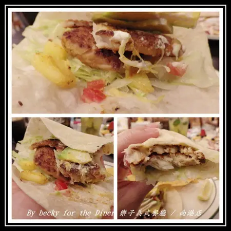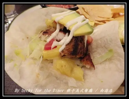 而墨西哥口味的塔可總共有三份,從上往下有著:酪梨、煎魚片、蕃茄丁、切塊鳳梨及生菜。