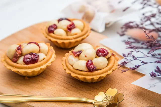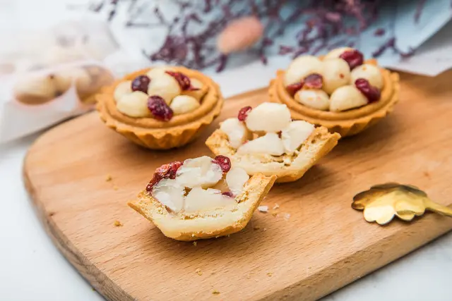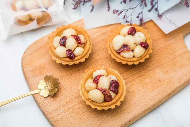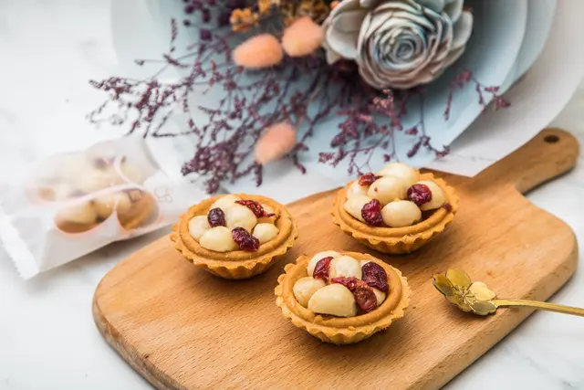 使用法國依思尼奶油ISIGNY的塔皮厚薄度剛好,入口酥脆充滿了奶油的甜香,夏威夷豆有著醇厚的堅果香氣及紮實口感,上頭還有一層薄脆的天然麥芽糖衣,三種不同層次的酥脆口感,加上酸甜蔓越莓果乾果乾搭配在一起更顯清甜脆口
