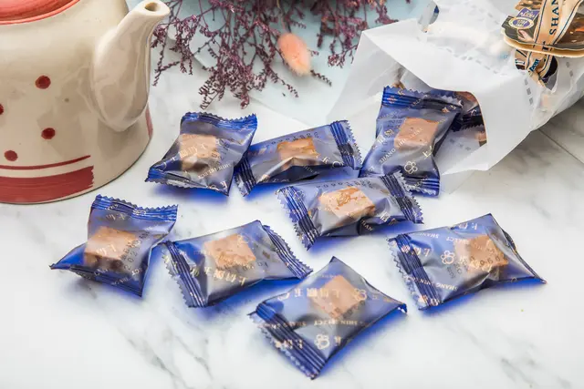 上信饌玉的太妃糖也是使用來自A.O.P認證的法國依思尼鮮奶油,所以乳香甘醇濃郁質地柔滑,手工熬煮焦糖讓太妃糖帶有高雅的大人風味,再加入了加州嚴選杏仁果,甜脆的口感一吃上癮!