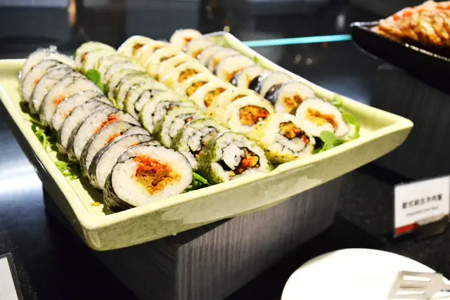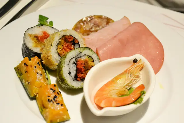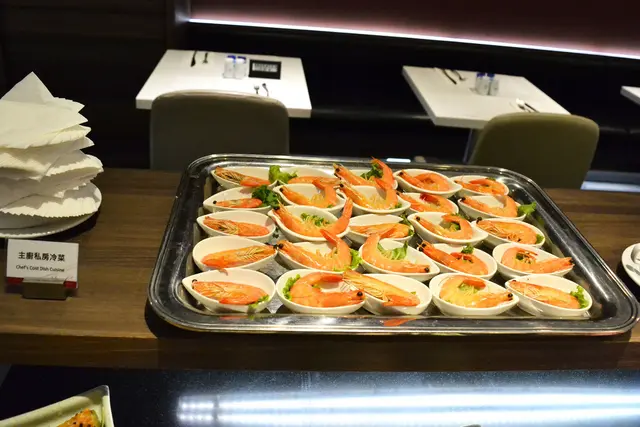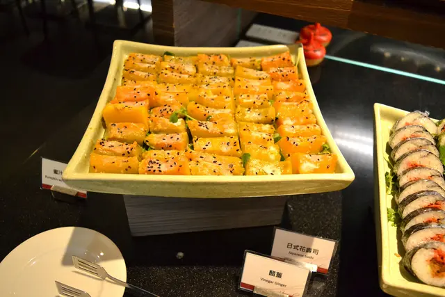 冷盤區,應該是和其他buffet最不一樣的地方,永安棧沒有提供生魚片,但有甜蝦、日式花壽司、歐式綜合冷肉盤和蜜汁南瓜。蝦子很新鮮,很好剝殼外,肉質保有鮮甜味;壽司很扎實。