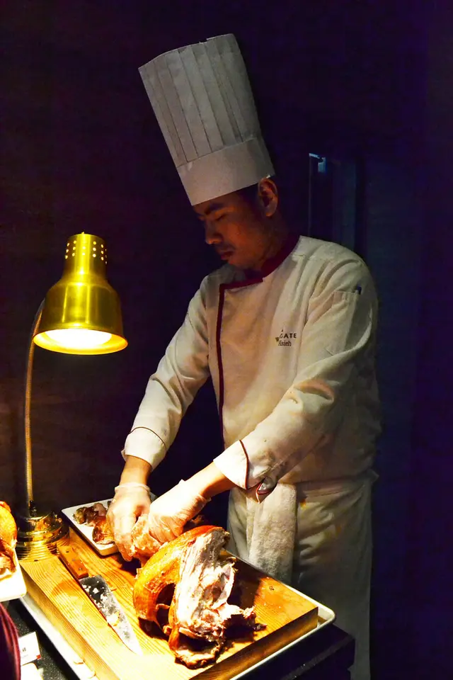 還有大廚旁邊貼心服務,熱騰騰的火雞肉一片片被撕開著放在旁邊,直接夾取即可,完全不怕弄髒手,還有醬料可以沾取,火雞外皮烤到金黃褐色,肉質不像雞肉那樣細緻,但也不會柴,搭配主廚特製醬料,整個讓人超滿足><