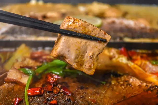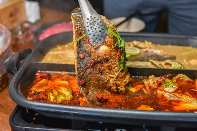 烤魚的湯底在上桌之後才會加進去,辣度介於微辣到小辣之間,煮過的食材都非常入味,但又不會死辣,時不時還可以感受到迷人的花椒香,川味麻辣沒有添加牛油,所以吃沒這麼油膩,不吃牛的朋友也可以吃唷,雖然沒有牛油,但香氣依然不減!