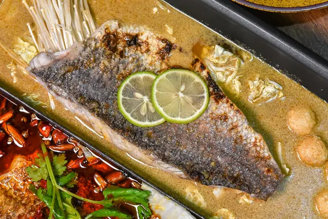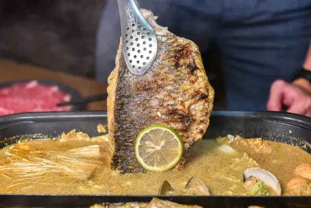 除了半片現點現烤的鱸魚,還有丸子、高麗菜、金針菇這些配料,覺得料不夠可以付費加點。