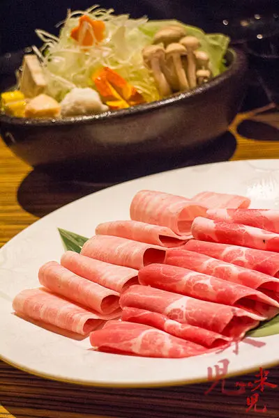 豬肉鍋的肉盤有松阪肉(豬頸肉)與大麥豬二種,可以吃到二種不同的肉質,比較白的是口感嫩中帶脆的松阪豬,而比較紅的是大麥豬梅花部位,吃起來較香甜而有點嚼勁。