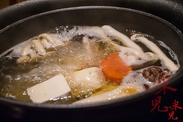牛肉鍋在吃之前也是先把蔬菜、菇類丟進去,先吃原味,這樣才能品嘗出這優雅細緻的湯頭鮮香,還有那股獨特的燻香氣。
