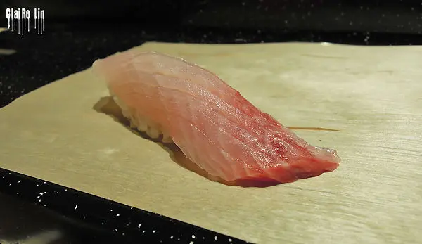 再來是第二貫野生紅魽。新鮮粉嫩的魚肉劃上幾刀精緻刀工,緊密貼合下面醋飯。