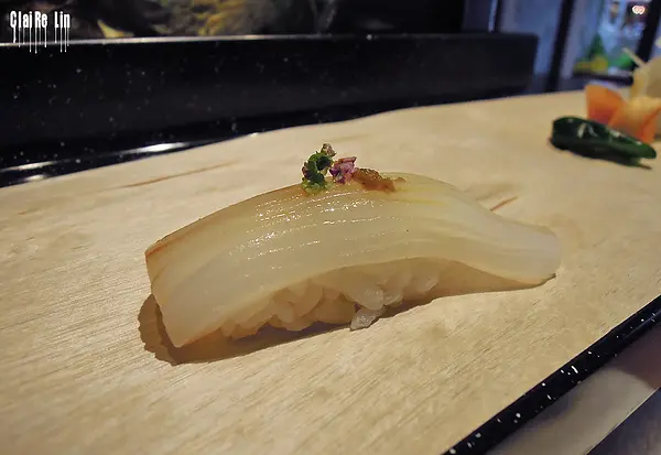潔白如雪的軟絲上還綴著些許紫蘇花~阿昇師傅真的很會搭配耶!雖然刀工不是炙烤過後會一層層翹起來的蜷曲造型,但細細的直條紋也很美。