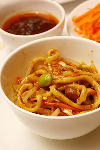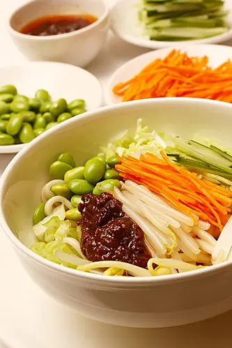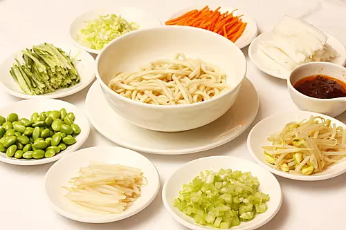 醡醬麵上桌,一碗麵配八小碟,共有毛豆、黃豆芽、綠豆芽、西芹丁、醡醬、蒜片、白菜芯絲、紅蘿蔔絲、小黃瓜絲~~