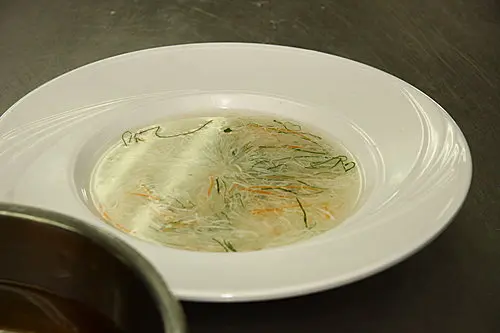把豆腐放到高湯裡慢慢化開,就變成他這次的名菜之一「紋絲豆腐」。